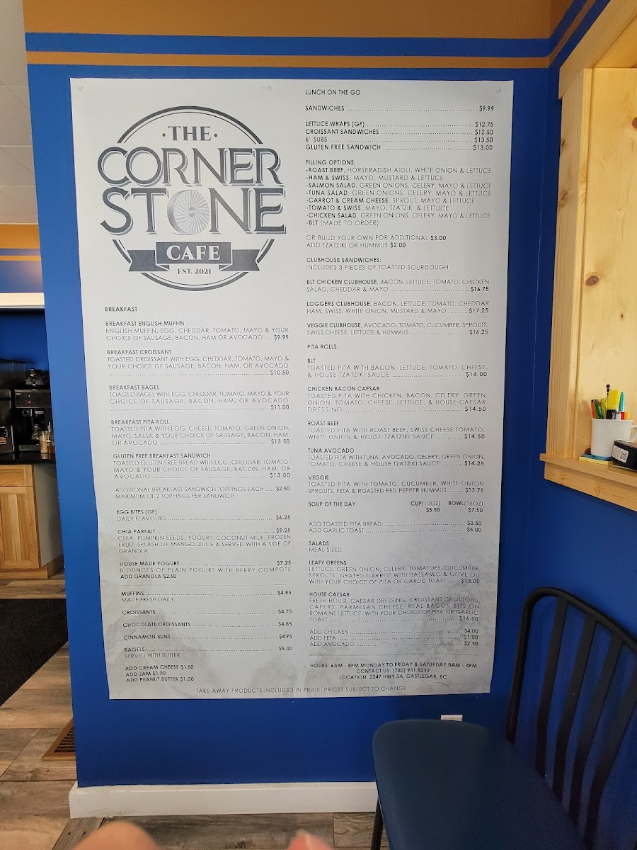 Welcome to The Cornerstone Cafe, a delightful haven tucked just off the highway at 2347 BC-3A, Castlegar. Known for its vibrant and mouthwatering dishes, this cafe offers a menu that showcases quality at reasonable prices. Start your day with delectable breakfast options like the Breakfast English Muffin or the Breakfast Croissant, each under CA$11.00, plus healthful choices like the Chia Parfait and House Made Yogurt.